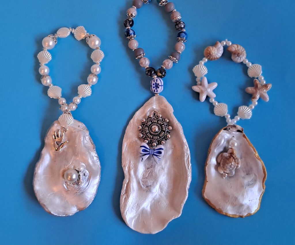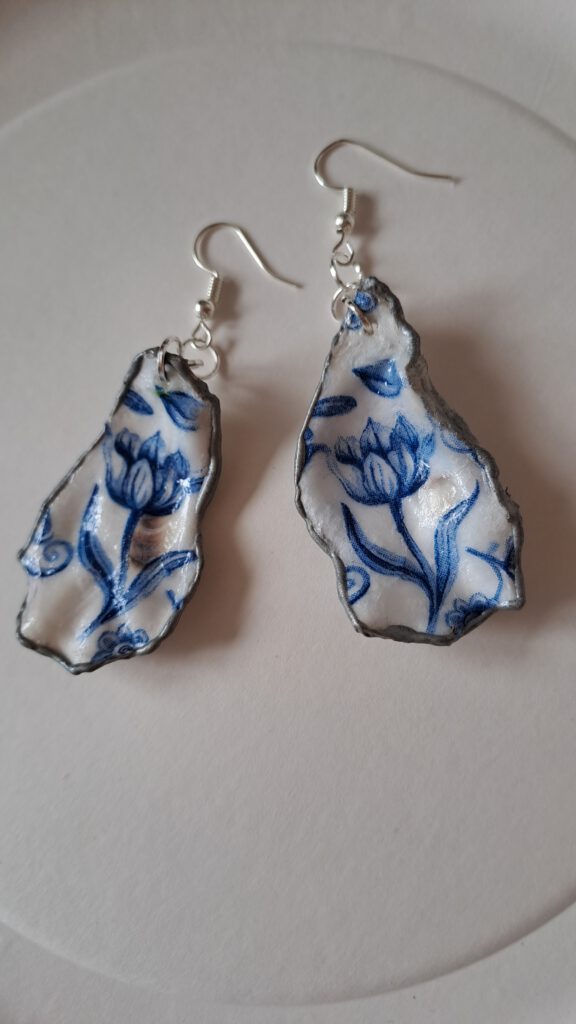 Sinds kort bewerk ik ook Oesterschelpen die ik op ons eiland vind. Soms bewerk ik ze met decoupage servetten, maar ik beschilder ook schelpen. Ik vind het ook leuk om er sieraden van te maken, of andere bruikbare accessoires.